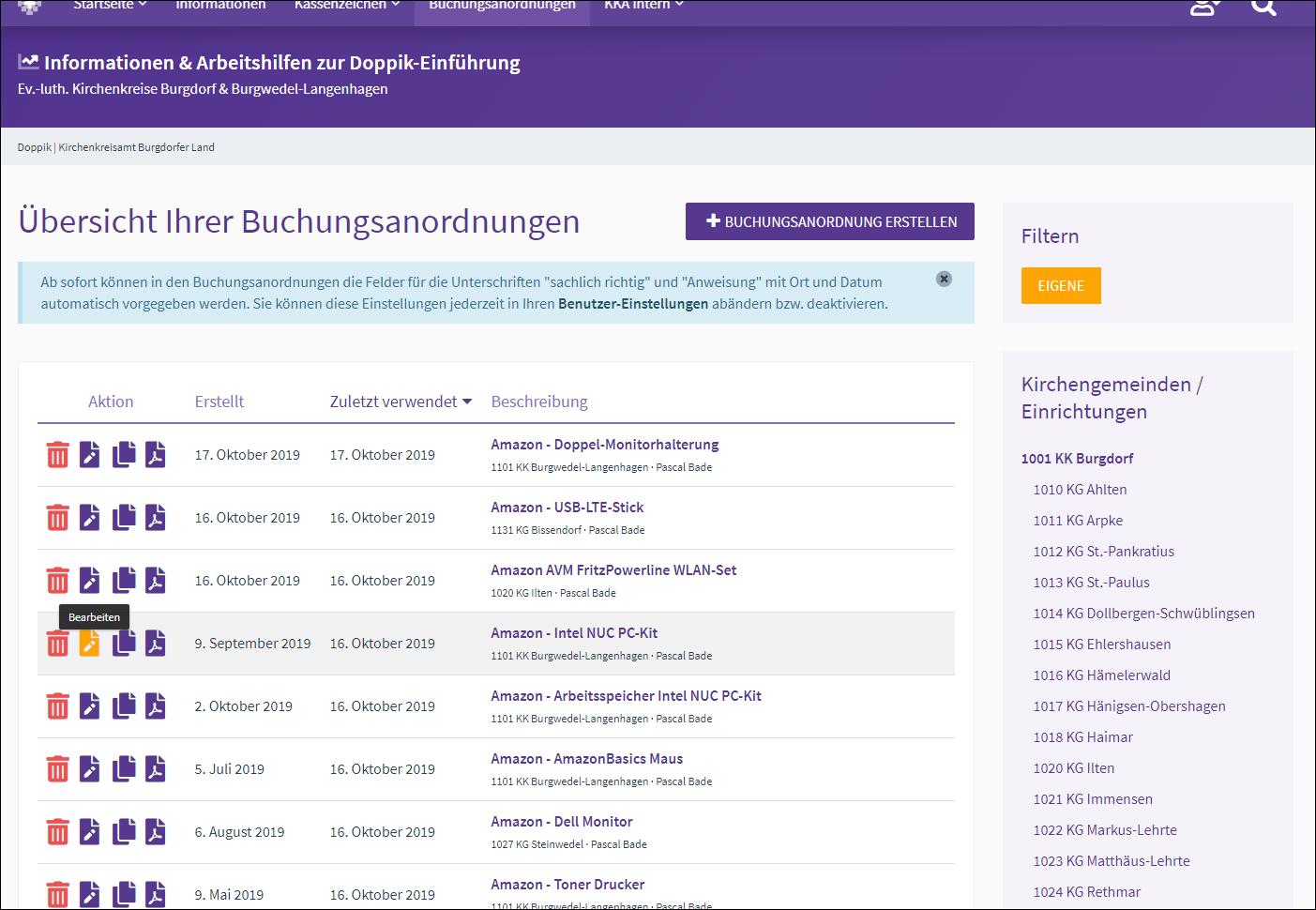 Mit diesem System können Buchungsanordnungen erstellt und gespeichert werden; Sie erhalten im Gegensatz zum speichern der PDF auf dem PC vom System bei Änderungen immer die aktuellste Buchungsanordnung und müssen nichts mehr unnötig doppelt oder neu erstellen!