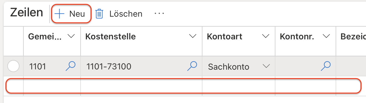 Die Aufteilung des Rechnungsbetrages auf zwei oder mehrere Kostenstellen ist weiterhin möglich. Bei der Eingabe der Rechnungsdaten kann in einer neuen Zeile der Betrag und die betreffende Kostenstelle eingeben werden. Entweder können Sie direkt in die Zeile unter der aktiven klicken, oder wählen oben „Neu“. Bitte beachten Sie, dass es nicht mehrere leere Zeilen gibt, da der Beleg sonst fehlerhaft markiert wird.