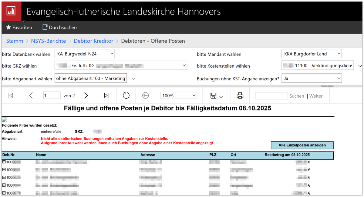 Den Bericht finden Sie über die Webberichte, wenn Sie die Kacheln NSYS-Berichte und anschließend Debitor Kreditor anklicken. Danach heißt der Bericht Debitoren - Offene Posten.